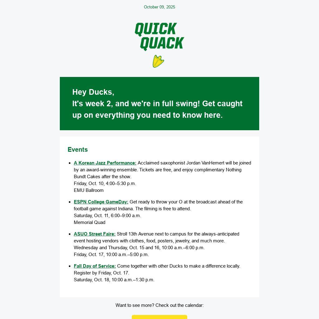 Fall Day of Service: Come together with other Ducks to make a difference locally. Register by Friday, Oct. 17.