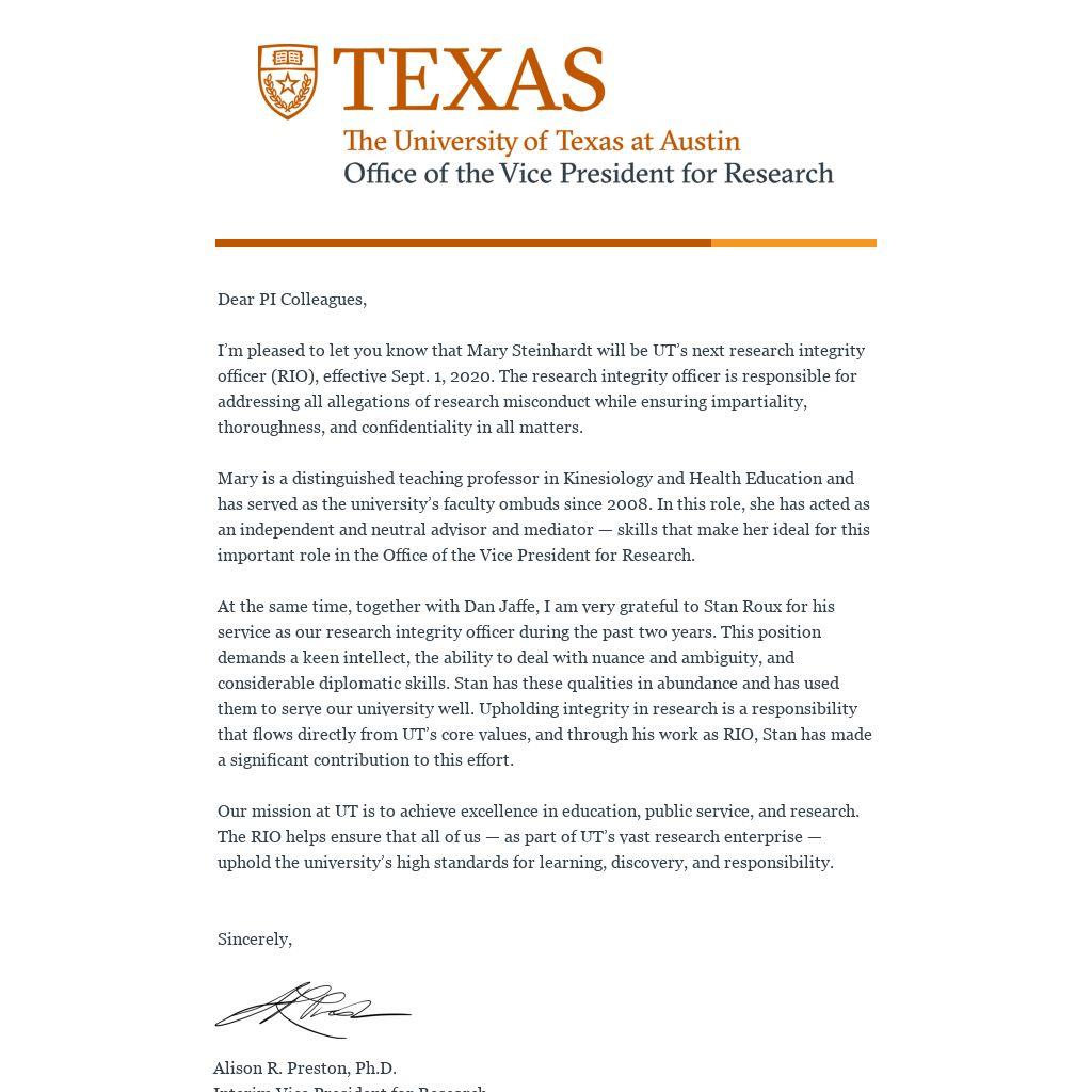 I’m pleased to let you know that Mary Steinhardt will be UT’s next research integrity officer (RIO), effective Sept. 1, 2020. The research integrity officer is responsible for addressing all allegations of research misconduct while ensuring impartiality, thoroughness, and confidentiality in all matters.