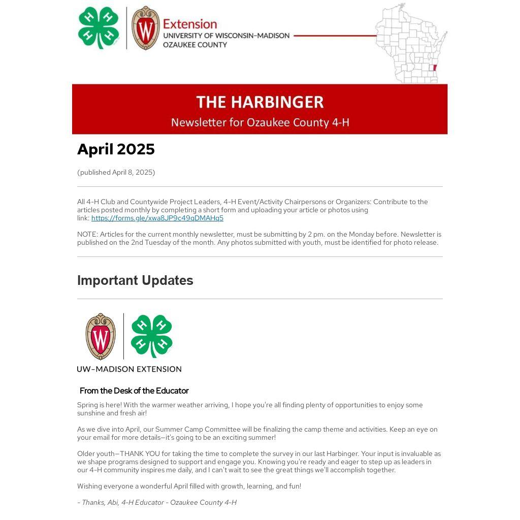 Harbinger Newsletter Published Monthly. The 4-H Harbinger newsletter will be published monthly on the second Tuesday of each month. Please adjust your 4-H club, group, and project announcement schedules as needed.