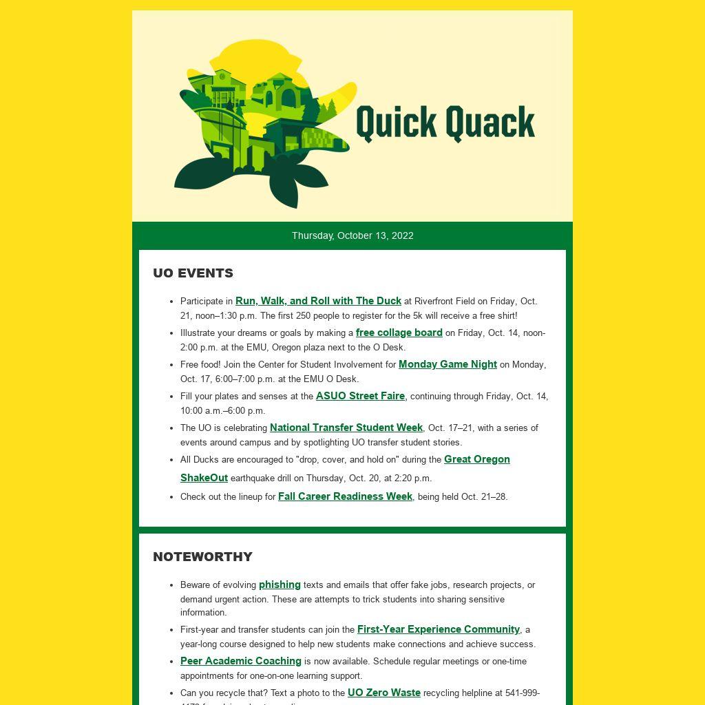 - All Ducks are encouraged to "drop, cover, and hold on" during the Great Oregon ShakeOut earthquake drill on Thursday, Oct. 20, at 2:20 p.m.