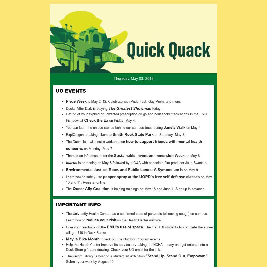 Help the Health Center improve its services by taking the NCHA survey and get entered into a Duck Store gift card drawing. Check your UO email for the link.