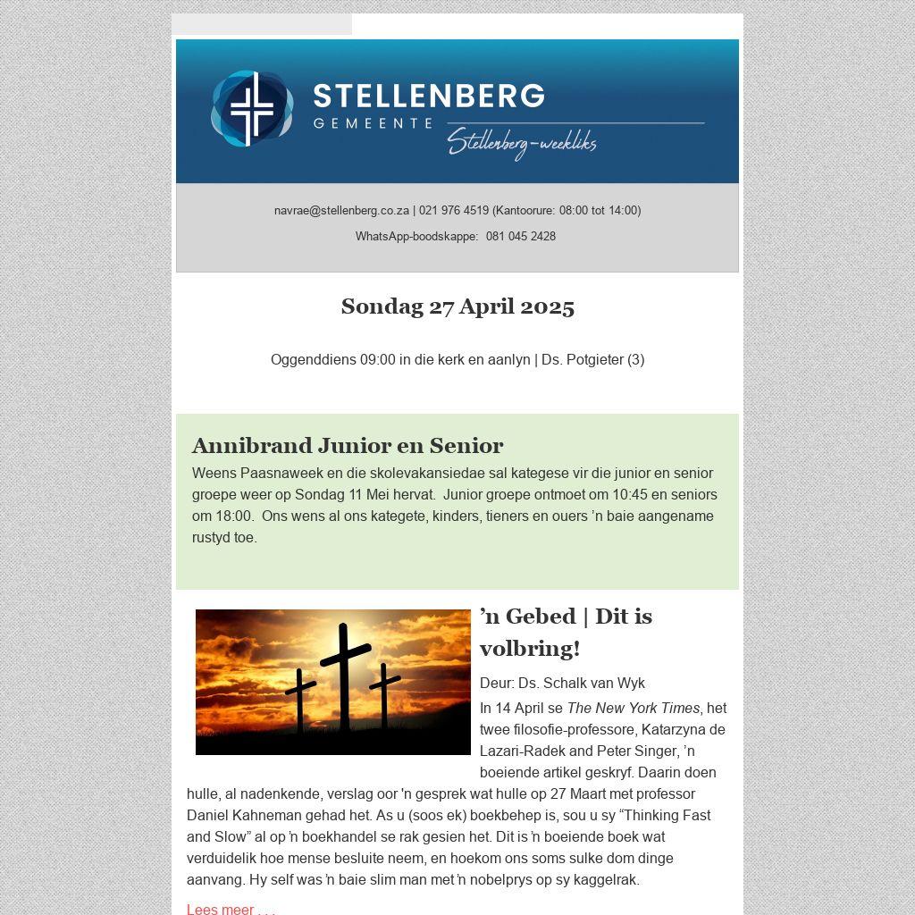 Jy kan gemeentenuus weekliks deur middel van die Stellenberg-weekliks per e-pos ontvang.  Stuur jou e-posadres aan sanel@stellenberg.co.za.