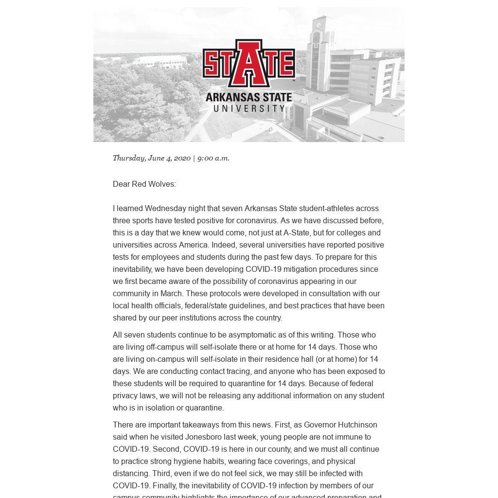 I learned Wednesday night that seven Arkansas State student-athletes across three sports have tested positive for coronavirus. As we have discussed before, this is a day that we knew would come, not just at A-State, but for colleges and universities across America. Indeed, several universities have reported positive tests for employees and students during the past few days. To prepare for this inevitability, we have been developing COVID-19 mitigation procedures since we first became aware of the possibility of coronavirus appearing in our community in March. These protocols were developed in consultation with our local health officials, federal/state guidelines, and best practices that have been shared by our peer institutions across the country.