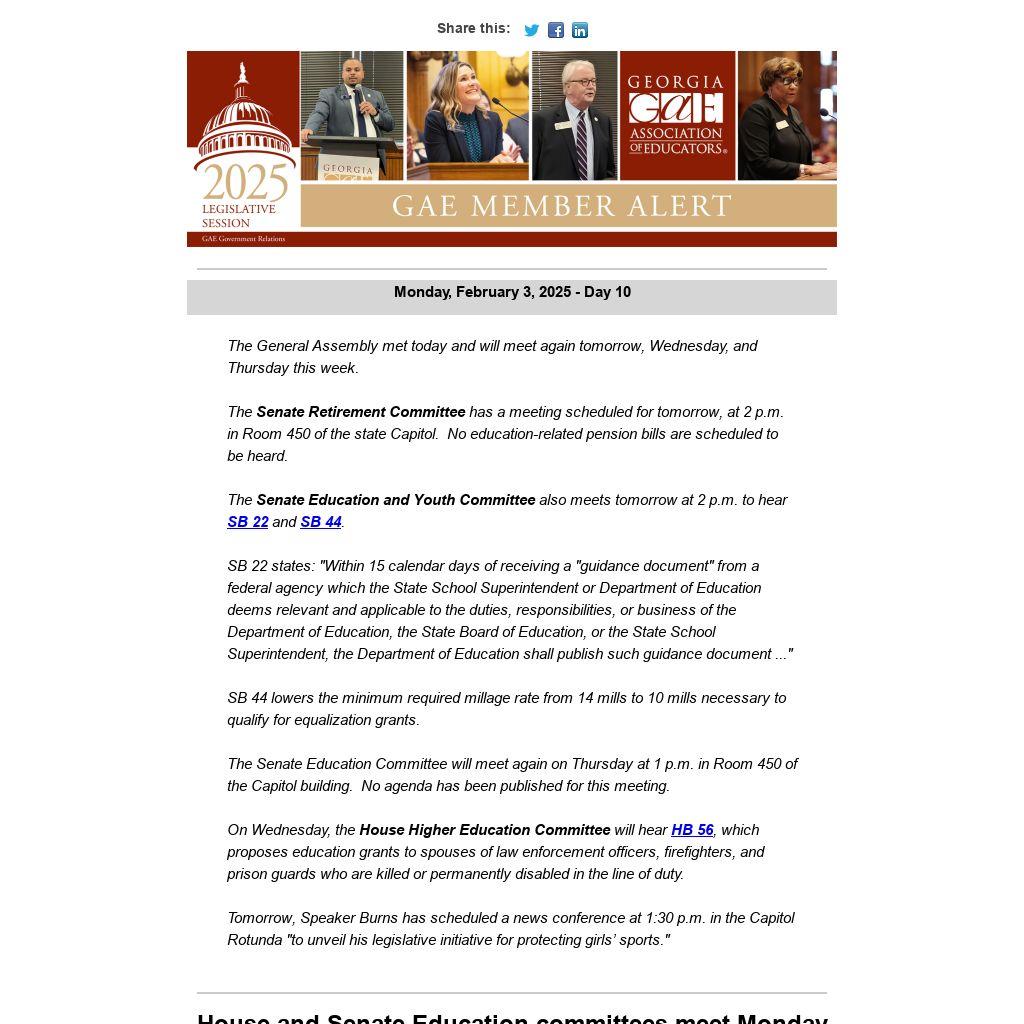 Members of the House Education Committee and the Senate Education and Youth Committee met for a joint hearing today.  Legislators heard presentations from the Georgia Emergency Management Agency (school safety), the Department of Behavioral Health and Developmental Disabilities (mental health), and the Georgia Council on Literacy.  The meeting was high on platitudes and short of specifics.  No legislation was heard.