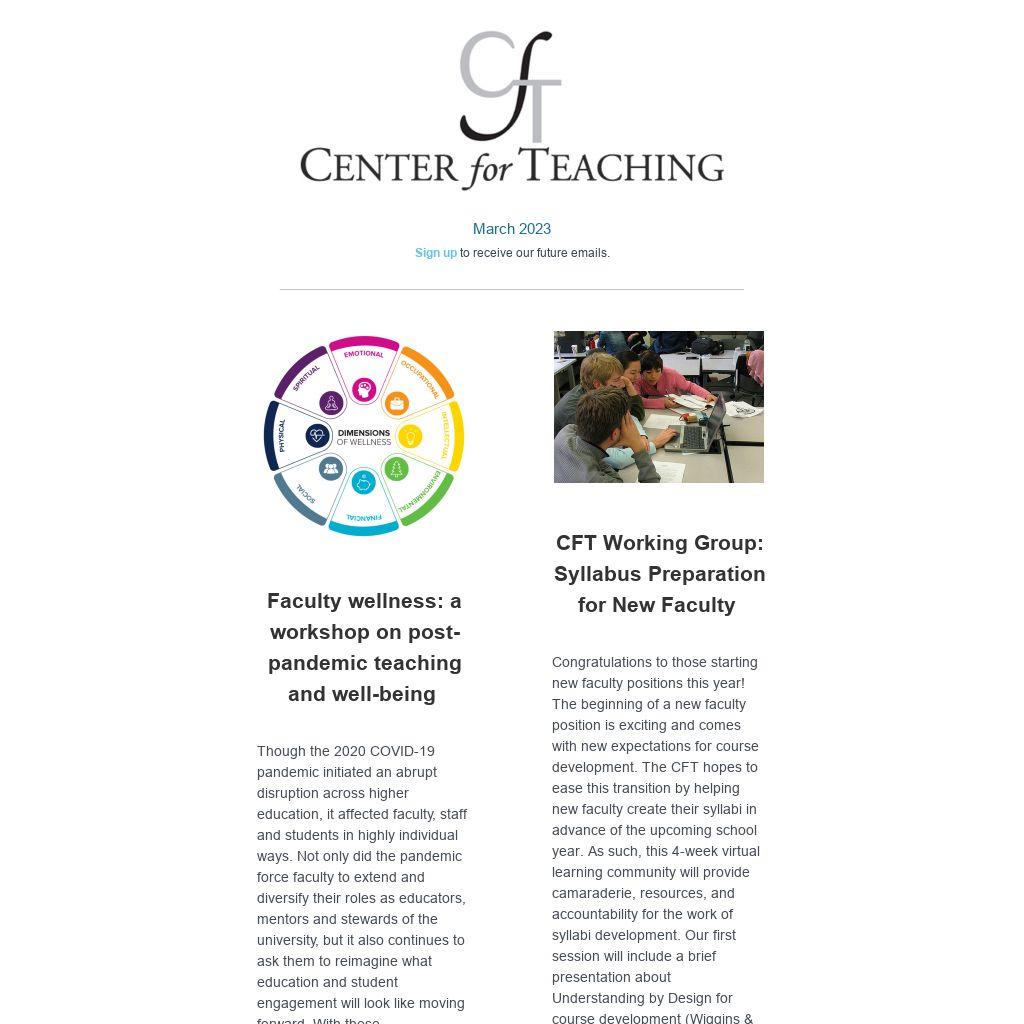 Though the 2020 COVID-19 pandemic initiated an abrupt disruption across higher education, it affected faculty, staff and students in highly individual ways. Not only did the pandemic force faculty to extend and diversify their roles as educators, mentors and stewards of the university, but it also continues to ask them to reimagine what education and student engagement will look like moving forward. With these responsibilities has come increased pressure, stress, feelings of inadequacy, dissatisfaction and the need to achieve a greater work-life balance. Please join the Center for Teaching to begin a dialogue on what constitutes faculty well-being, its cultivation, and its relationship with dynamic, challenging, and effective teaching. We hope you can join us. The workshop will be held via Zoom on March 24 from 10:00 to 11:00 am. If you are interested in attending, please register here.