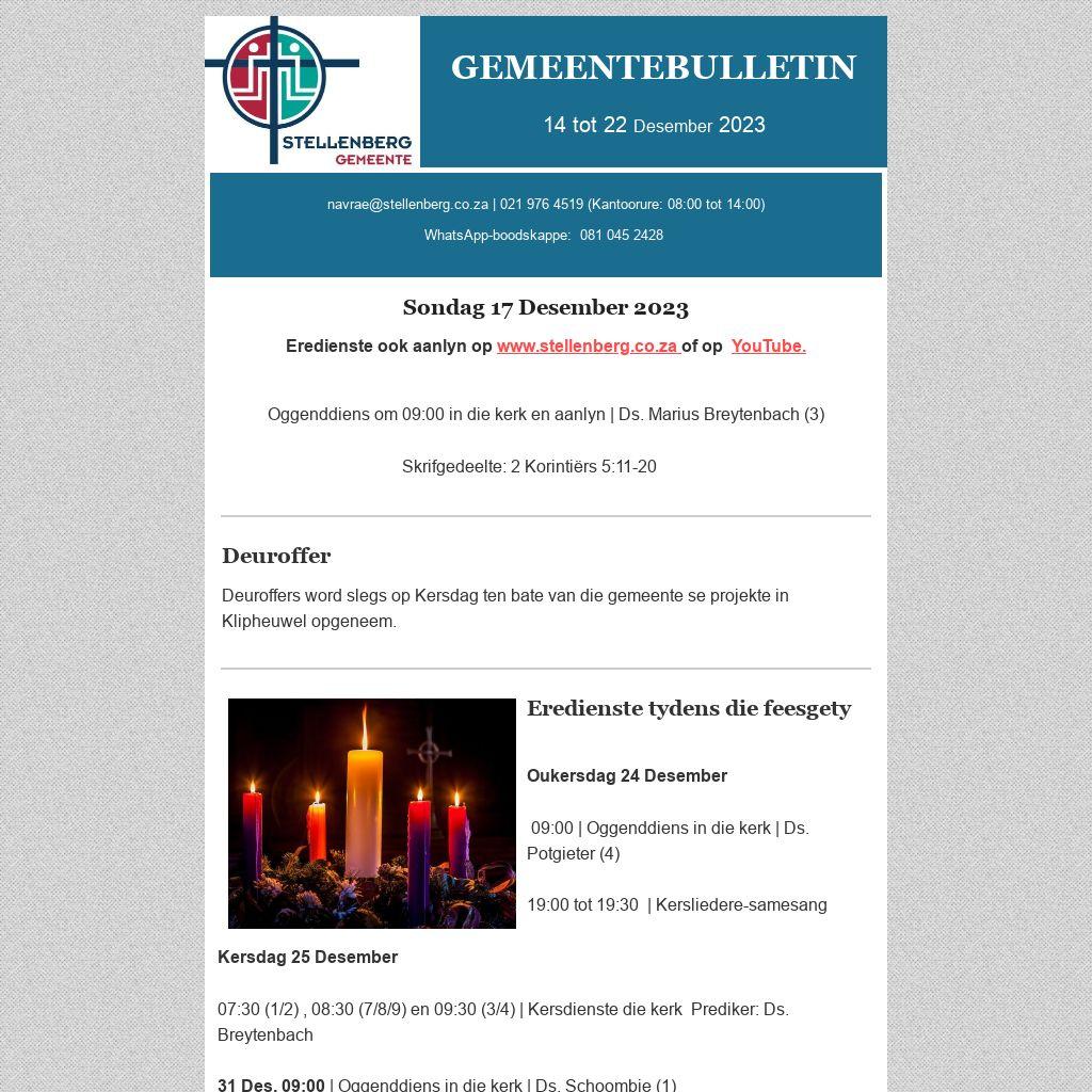 - Stella Dawn Steyn (23/03/1935 - 13/12/2023). Stella was sedert 1992 ’n meelewende lidmaat van die gemeente en ’n inwoner van Edelweiss. Ons opregte meegevoel met haar vier kinders wat sy agterlaat. Gedenkdiens: Woensdag 20 Desember om 10:30 in die kerk.