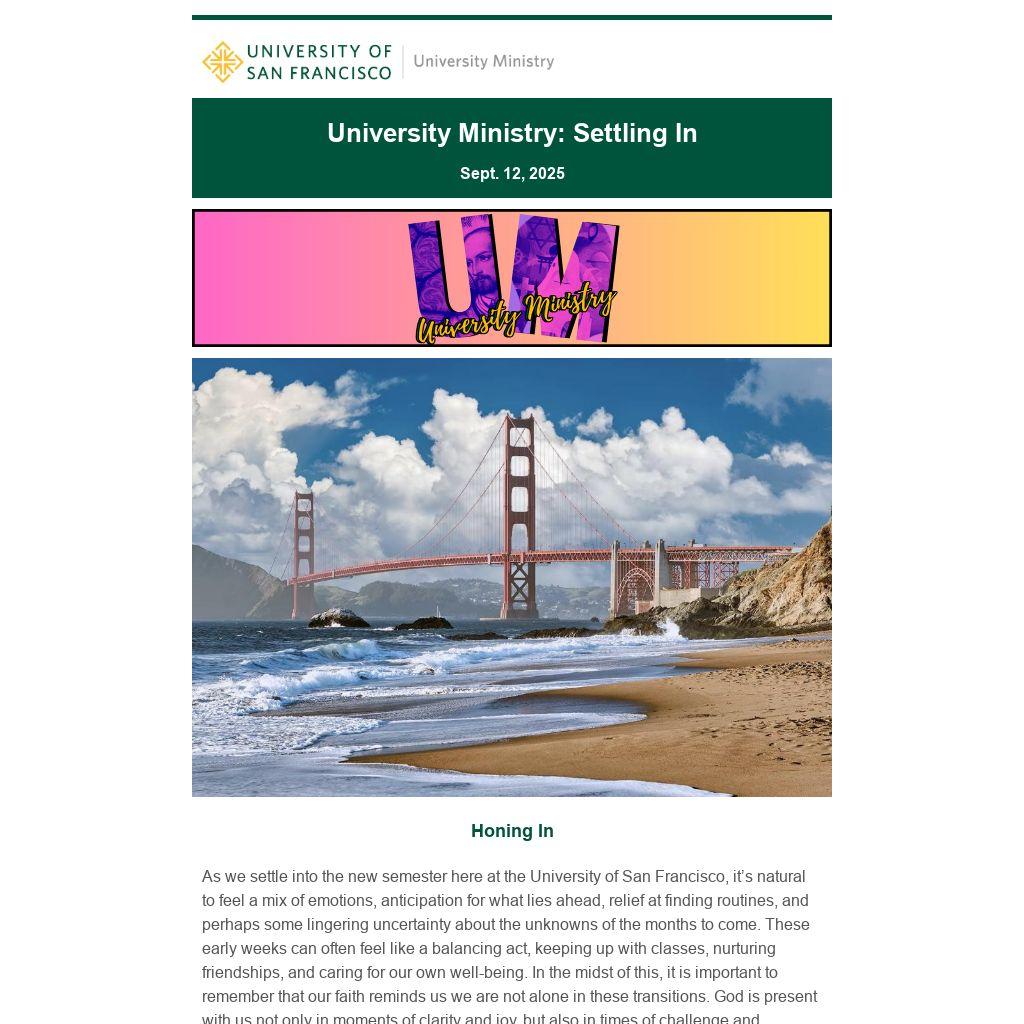 As we settle into the new semester here at the University of San Francisco, it’s natural to feel a mix of emotions, anticipation for what lies ahead, relief at finding routines, and perhaps some lingering uncertainty about the unknowns of the months to come. These early weeks can often feel like a balancing act, keeping up with classes, nurturing friendships, and caring for our own well-being. In the midst of this, it is important to remember that our faith reminds us we are not alone in these transitions. God is present with us not only in moments of clarity and joy, but also in times of challenge and restlessness.