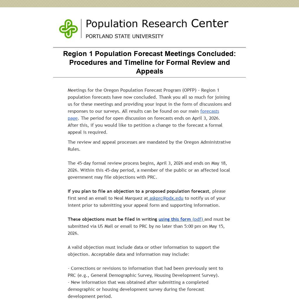 If you plan to file an objection to a proposed population forecast, please first send an email to Neal Marquez at askprc@pdx.edu to notify us of your intent prior to submitting your appeal form and supporting information.