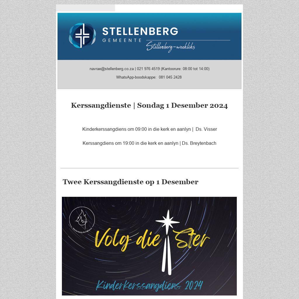 Plaas gerus ’n advertensie in die Stellenberg-weekliks. Die nuusblad word tans weekliks elektronies aan 2 500 persone gestuur en is ook op die gemeente se webwerf beskikbaar. Advertensies sal slegs aanlyn beskikbaar wees en word nie in gedrukte formaat uitgegee nie. Lees meer . . .