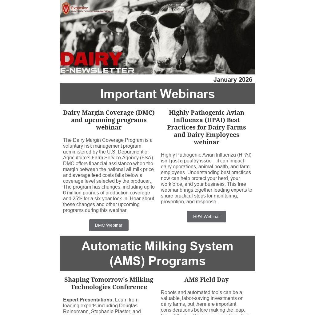 Milk Quality from the Udder World, Spanish only, location varies | | Feb 25 | Shaping Tomorrow's Milking Technologies, Prairie du Chien | | Mar 6 |
