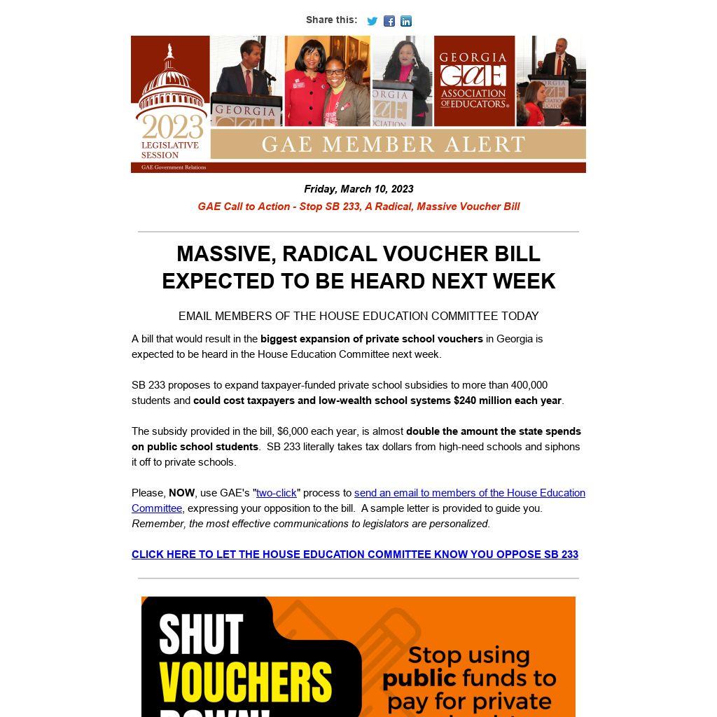 Friday, March 10, 2023 GAE Call to Action - Stop SB 233, A Radical, Massive Voucher Bill