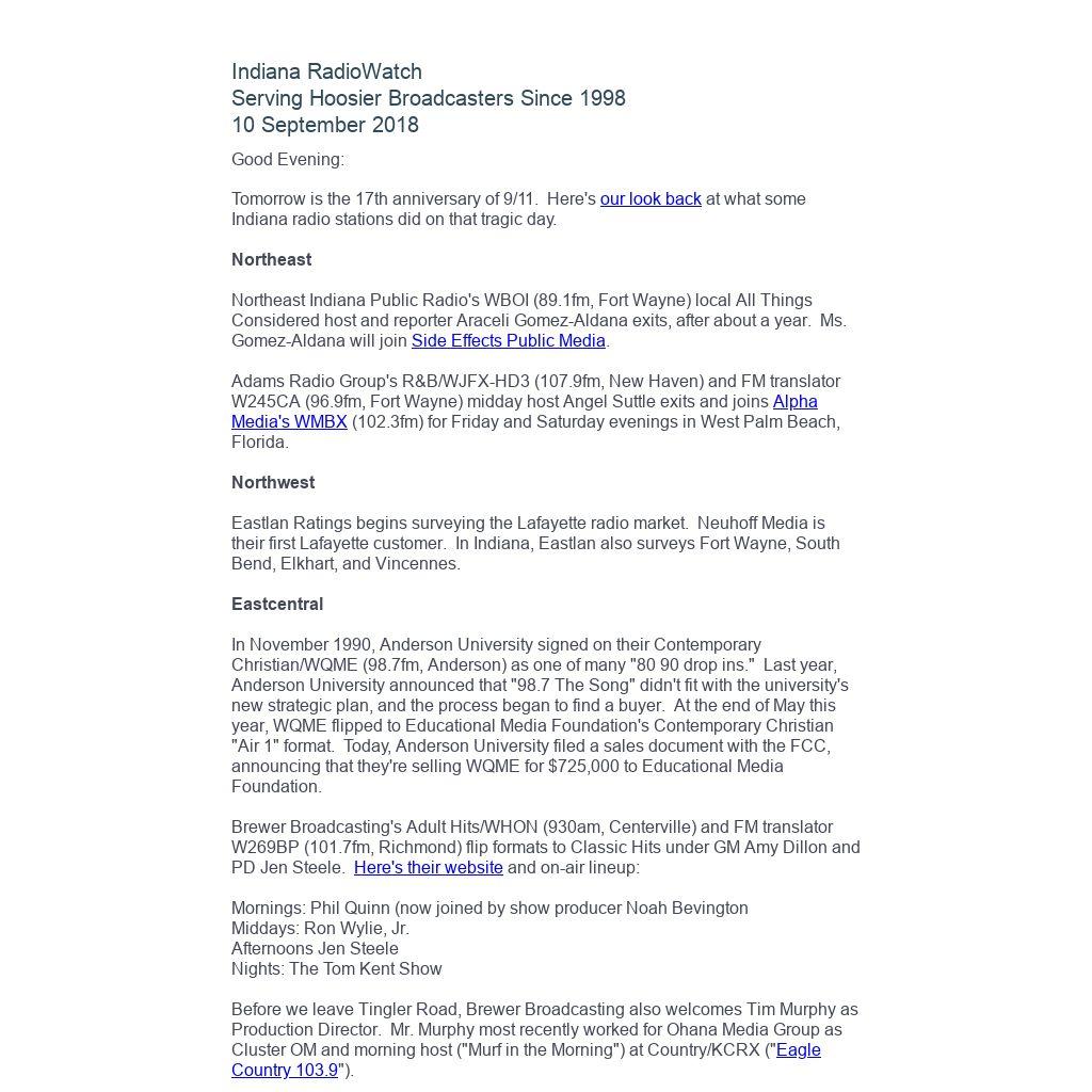Indiana RadioWatch subscriptions are free. To subscribe, send an e-mail to irw@well.com and we'll add you. After publication, we archive Indiana RadioWatch on the Indiana Radio Archive at http://www.indianaradio.net. Please e-mail us your news stories and employment opportunities.