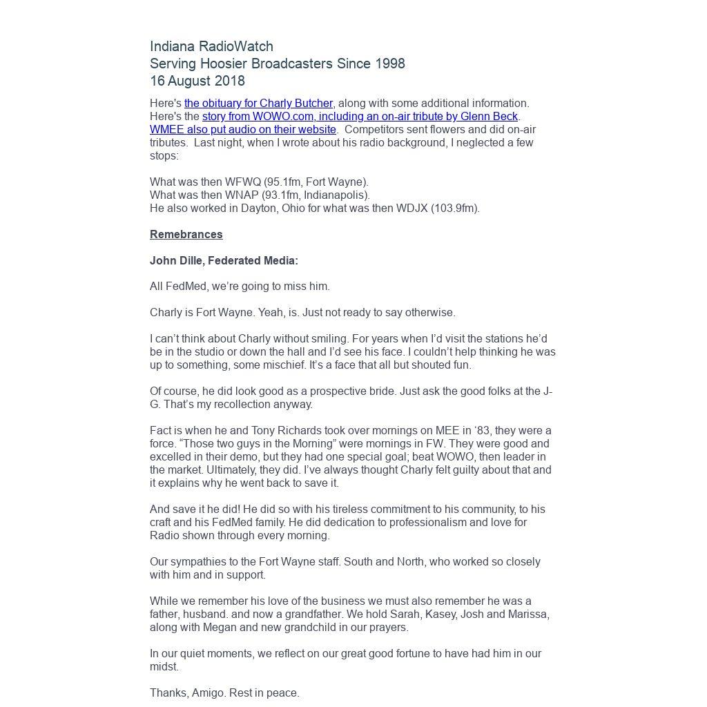Mark Goff, Eagle Communications, Hays, Kansas: "How sad! Charly Butcher was a class act. I was an engineer at FedMed during the "Those Two Guys" era. Spent many early mornings with them. He will be missed. My condolences to the family and all the fine folks on Maples Rd."