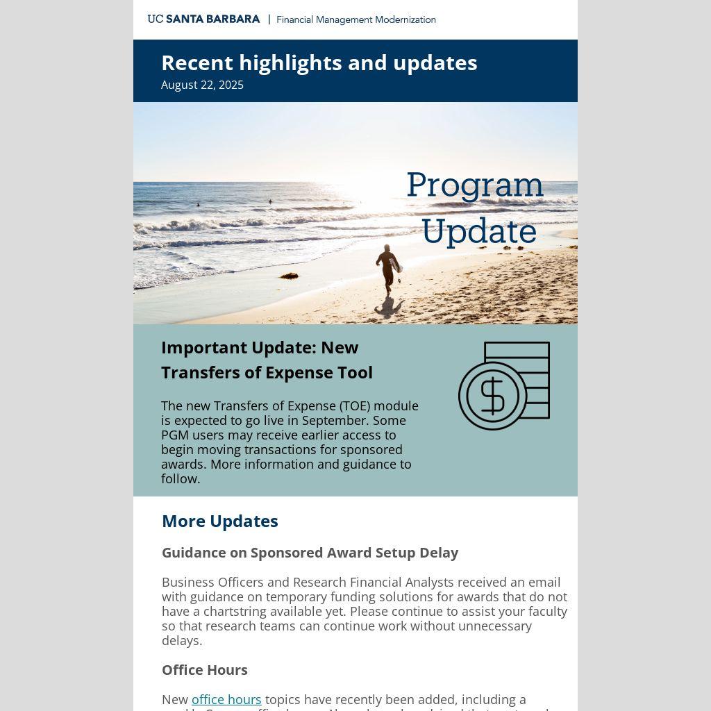 The new Transfers of Expense (TOE) module is expected to go live in September. Some PGM users may receive earlier access to begin moving transactions for sponsored awards. More information and guidance to follow.