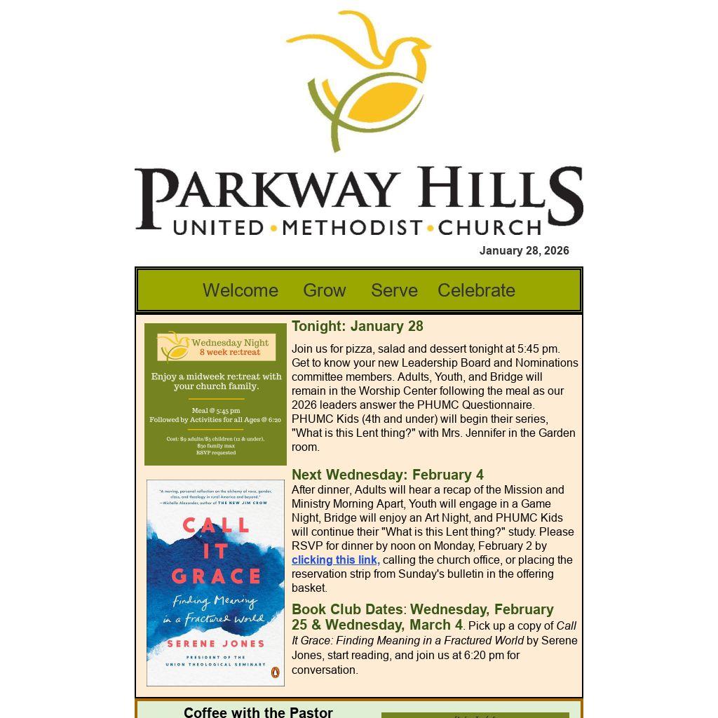 Get to know your new Leadership Board and Nominations committee members. Adults, Youth, and Bridge will remain in the Worship Center following the meal as our 2026 leaders answer the PHUMC Questionnaire. PHUMC Kids (4th and under) will begin their series, "What is this Lent thing?" with Mrs. Jennifer in the Garden room. Next Wednesday: February 4