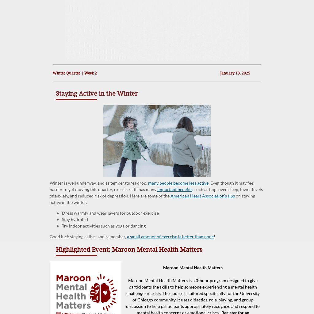 Maroon Mental Health Matters is a 3-hour program designed to give participants the skills to help someone experiencing a mental health challenge or crisis. The course is tailored specifically for the University of Chicago community. It uses didactics, role-playing, and group discussion to help participants appropriately recognize and respond to mental health concerns or emotional crises. Register for an upcoming student training or staff/faculty training .