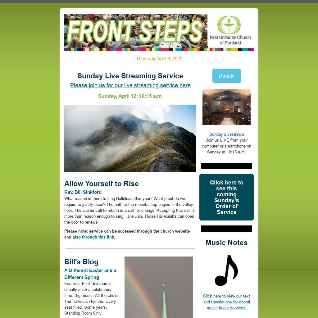 If you have an item you’d like published in our weekly Front Steps (eNews) or the Sunday Bulletin, please submit it here and include in the subject line “For eNews” –or– “For Sunday Bulletin” –or– “For eNews and Sunday Bulletin.”