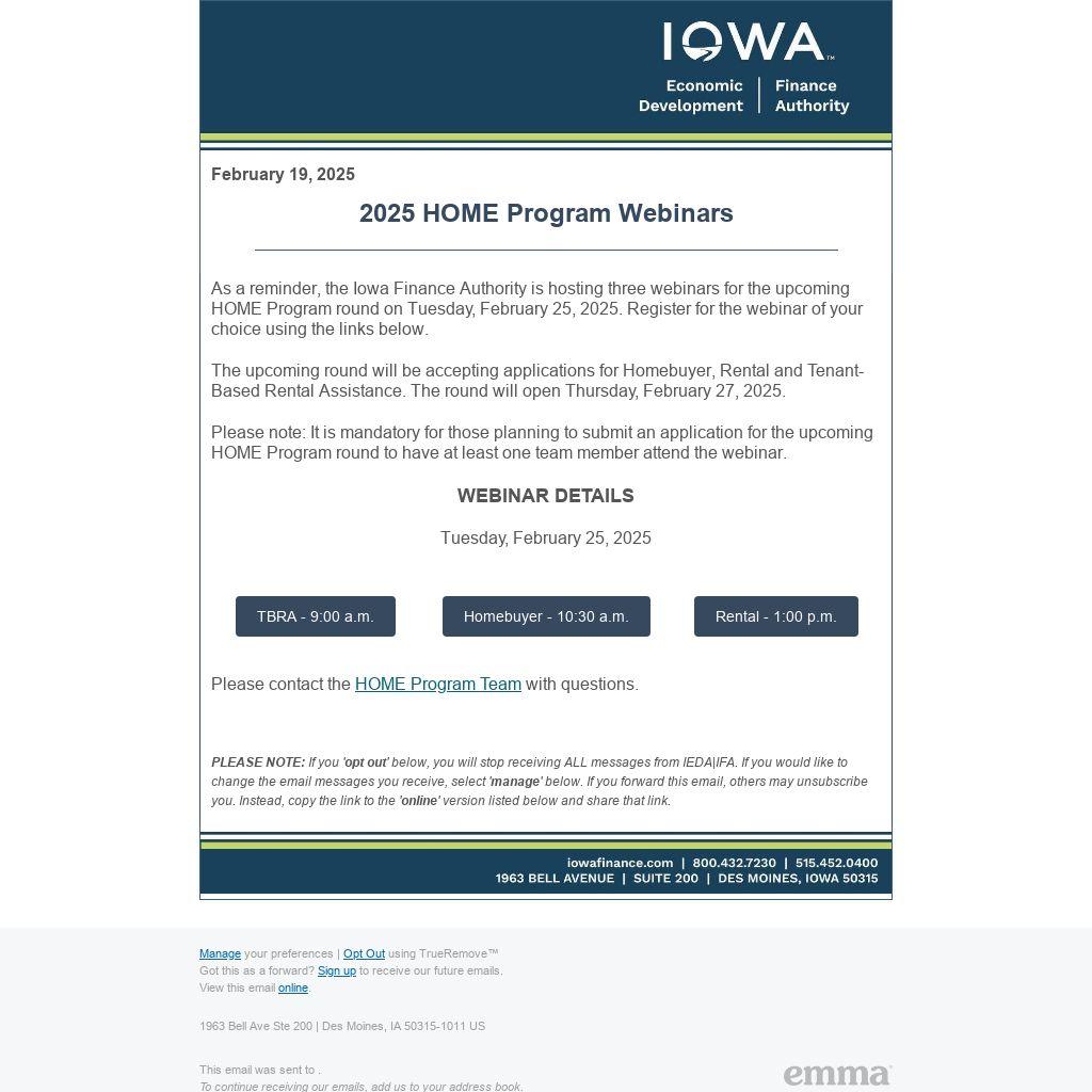 As a reminder, the Iowa Finance Authority is hosting three webinars for the upcoming HOME Program round on Tuesday, February 25, 2025. Register for the webinar of your choice using the links below.