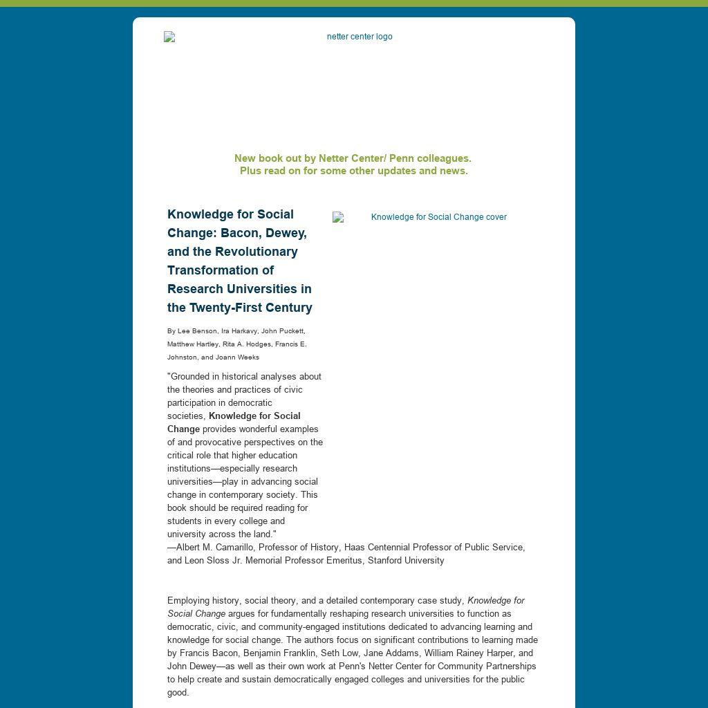 Employing history, social theory, and a detailed contemporary case study, Knowledge for Social Change argues for fundamentally reshaping research universities to function as democratic, civic, and community-engaged institutions dedicated to advancing learning and knowledge for social change. The authors focus on significant contributions to learning made by Francis Bacon, Benjamin Franklin, Seth Low, Jane Addams, William Rainey Harper, and John Dewey—as well as their own work at Penn's Netter Center for Community Partnerships to help create and sustain democratically engaged colleges and universities for the public good.