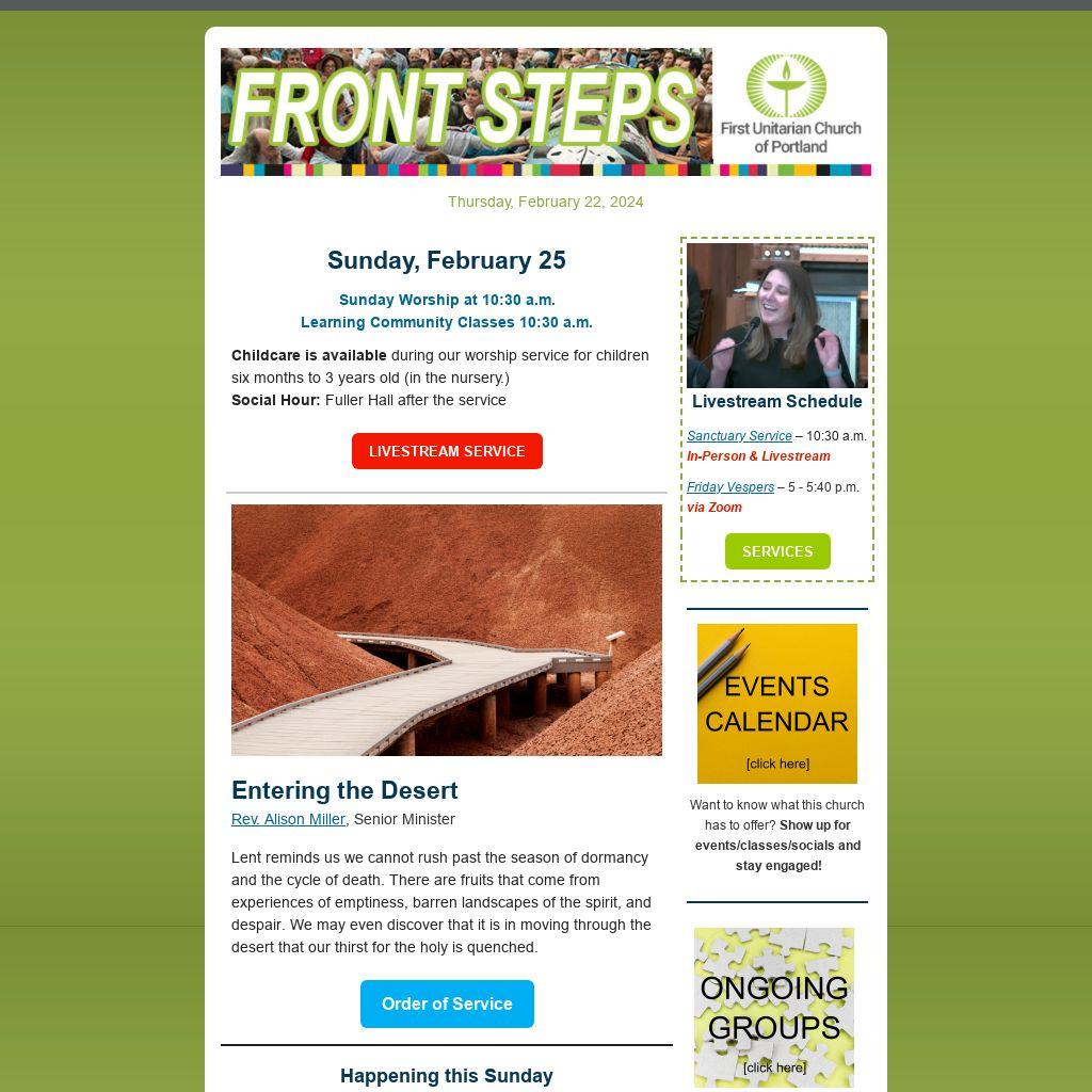 Have a Submission for E-News?If you have a church-related submission you would like published in our weekly Front Steps (E-News), please submit it here with subject line “For E-News.”
