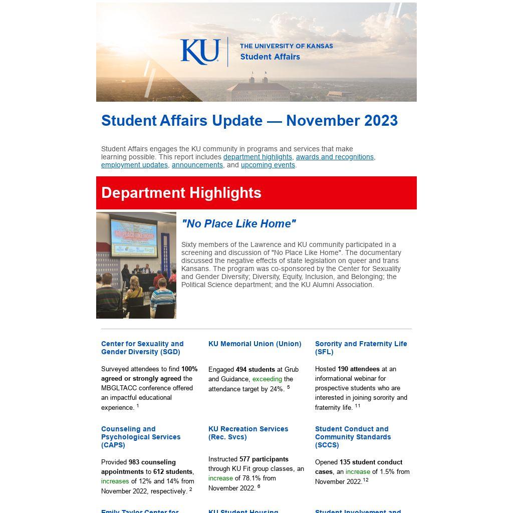 Sixty members of the Lawrence and KU community participated in a screening and discussion of "No Place Like Home". The documentary discussed the negative effects of state legislation on queer and trans Kansans. The program was co-sponsored by the Center for Sexuality and Gender Diversity; Diversity, Equity, Inclusion, and Belonging; the Political Science department; and the KU Alumni Association.