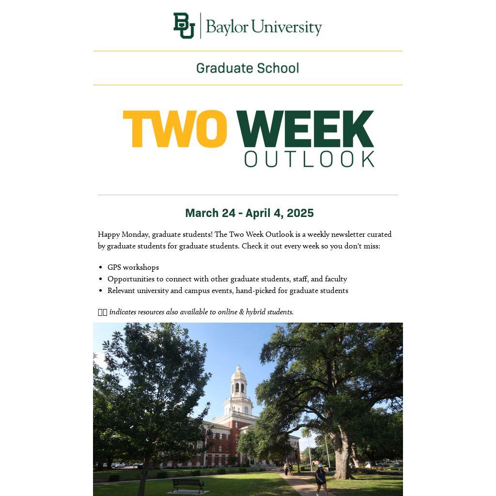 Happy Monday, graduate students! The Two Week Outlook is a weekly newsletter curated by graduate students for graduate students. Check it out every week so you don't miss:
