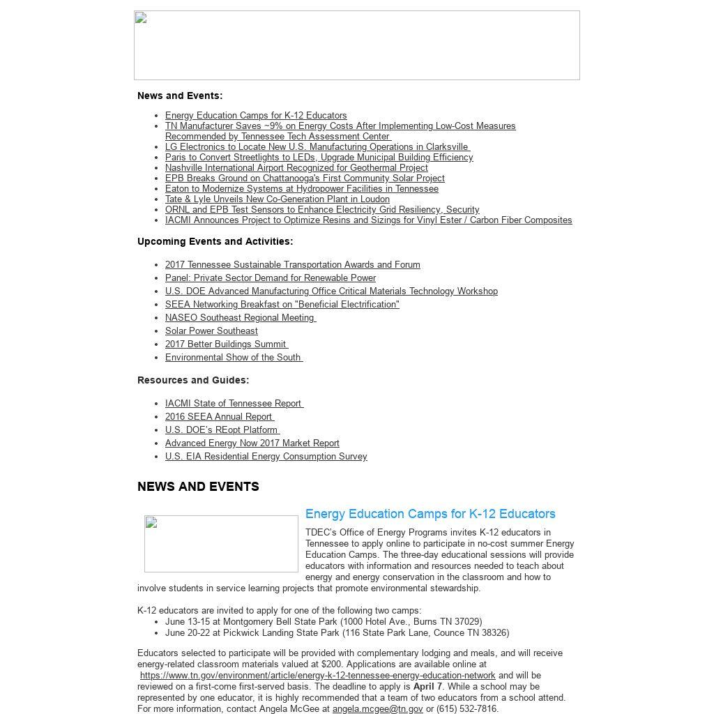 Educators selected to participate will be provided with complementary lodging and meals, and will receive energy-related classroom materials valued at $200. Applications are available online at https://www.tn.gov/environment/article/energy-k-12-tennessee-energy-education-network and will be reviewed on a first-come first-served basis. The deadline to apply is April 7. While a school may be represented by one educator, it is highly recommended that a team of two educators from a school attend. For more information, contact Angela McGee at angela.mcgee@tn.gov or (615) 532-7816.