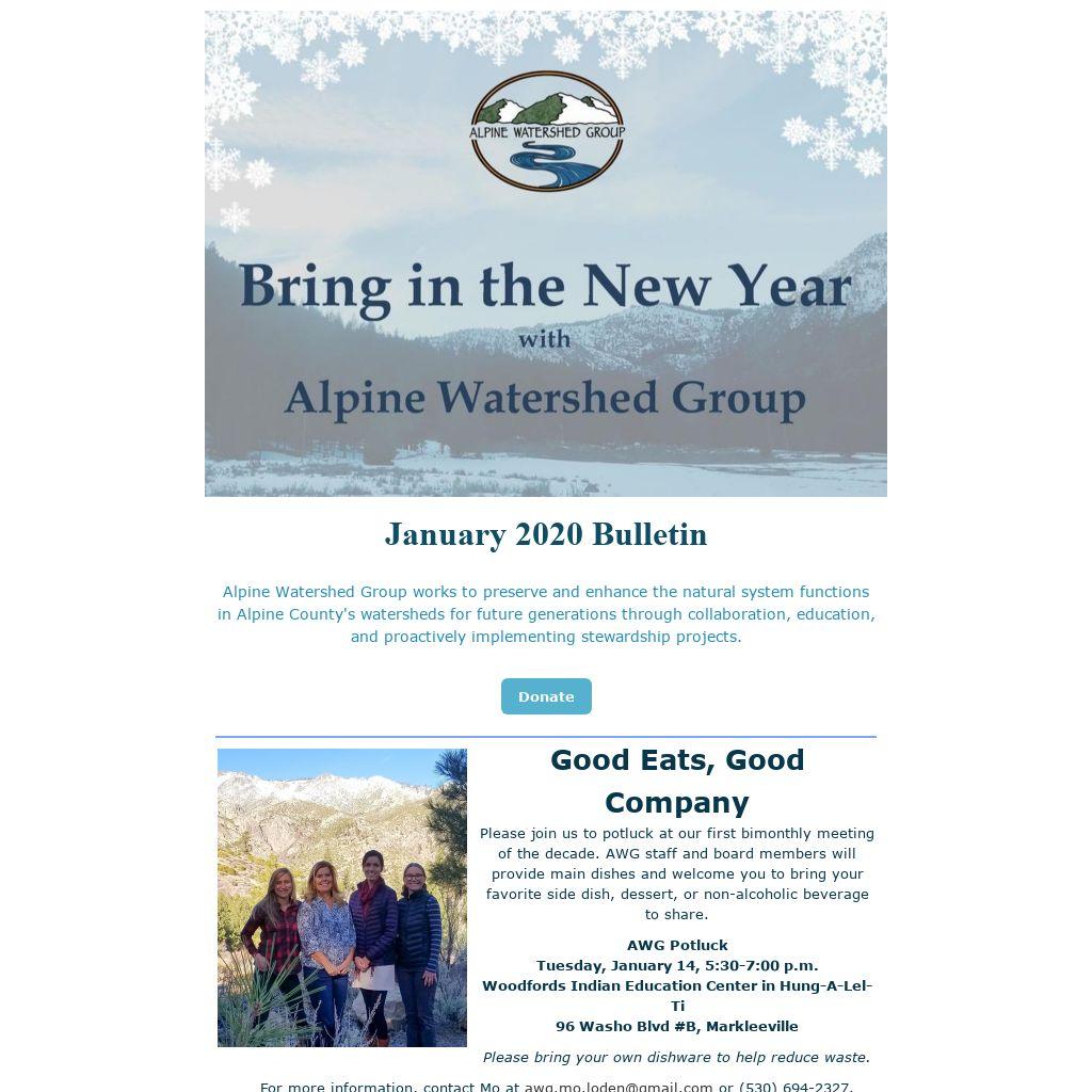 Please join us to potluck at our first bimonthly meeting of the decade. AWG staff and board members will provide main dishes and welcome you to bring your favorite side dish, dessert, or non-alcoholic beverage to share.