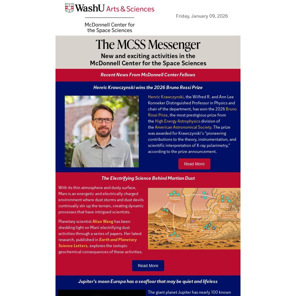 Henric Krawczynski, the Wilfred R. and Ann Lee Konneker Distinguished Professor in Physics and chair of the department, has won the 2026 Bruno Rossi Prize, the most prestigious prize from the High Energy Astrophysics division of the American Astronomical Society. The prize was awarded for Krawczynski’s “pioneering contributions to the theory, instrumentation, and scientific interpretation of X-ray polarimetry,” according to the prize announcement.