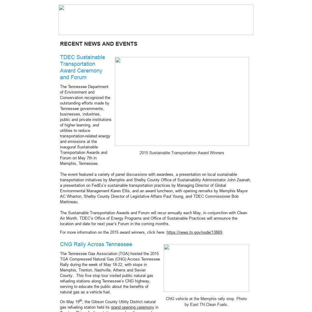 The Sustainable Transportation Awards and Forum will recur annually each May, in conjunction with Clean Air Month. TDEC’s Office of Energy Programs and Office of Sustainable Practices will announce the location and date for next year’s Forum in the coming months.