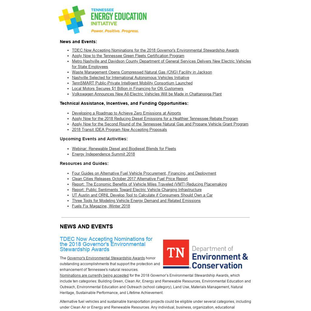 | TDEC Now Accepting Nominations for the 2018 Governor's Environmental Stewardship Awards The Governor's Environmental Stewardship Awards honor outstanding accomplishments that support the protection and enhancement of Tennessee's natural resources. Nominations are currently being accepted for the 2018 Governor’s Environmental Stewardship Awards, which include ten categories: Building Green, Clean Air, Energy and Renewable Resources, Environmental Education and Outreach, Environmental Education and Outreach (school category), Land Use, Materials Management, Natural Heritage, Sustainable Performance, and Lifetime Achievement. Alternative fuel vehicles and sustainable transportation projects could be eligible under several categories, including under Clean Air or Energy and Renewable Resources. Any individual, business, organization, educational institution, or agency is eligible, provided it is located in Tennessee and the project was completed during the 2017 calendar year. A panel of judges will select award recipients based on criteria including level of project or program completion, innovation, and public education. The deadline for nominations is March 30, 2018. Award recipients will be announced in May 2018.