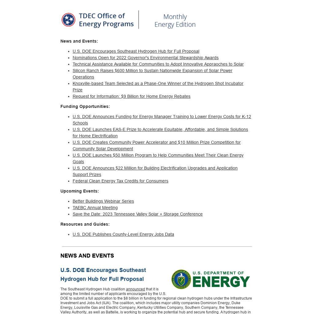 The Tennessee Advanced Energy Business Council (TAEBC) Annual Meeting allows TAEBC members, stakeholders, and potential members to gather from across the state to celebrate Tennessee’s growing advanced energy economy. The event will cover 2022 accomplishments, the future of the electric vehicle supply chain, TAEBC member highlights, partnership updates, and more. The Annual Meeting is scheduled for March 7 from 1:00 – 4:00 PM Central in Franklin, TN.