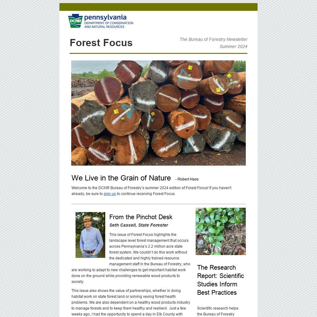 This issue of Forest Focus highlights the landscape level forest management that occurs across Pennsylvania’s 2.2 million acre state forest system. We couldn’t do this work without the dedicated and highly trained resource management staff in the Bureau of Forestry, who are working to adapt to new challenges to get important habitat work done on the ground while providing renewable wood products to society.