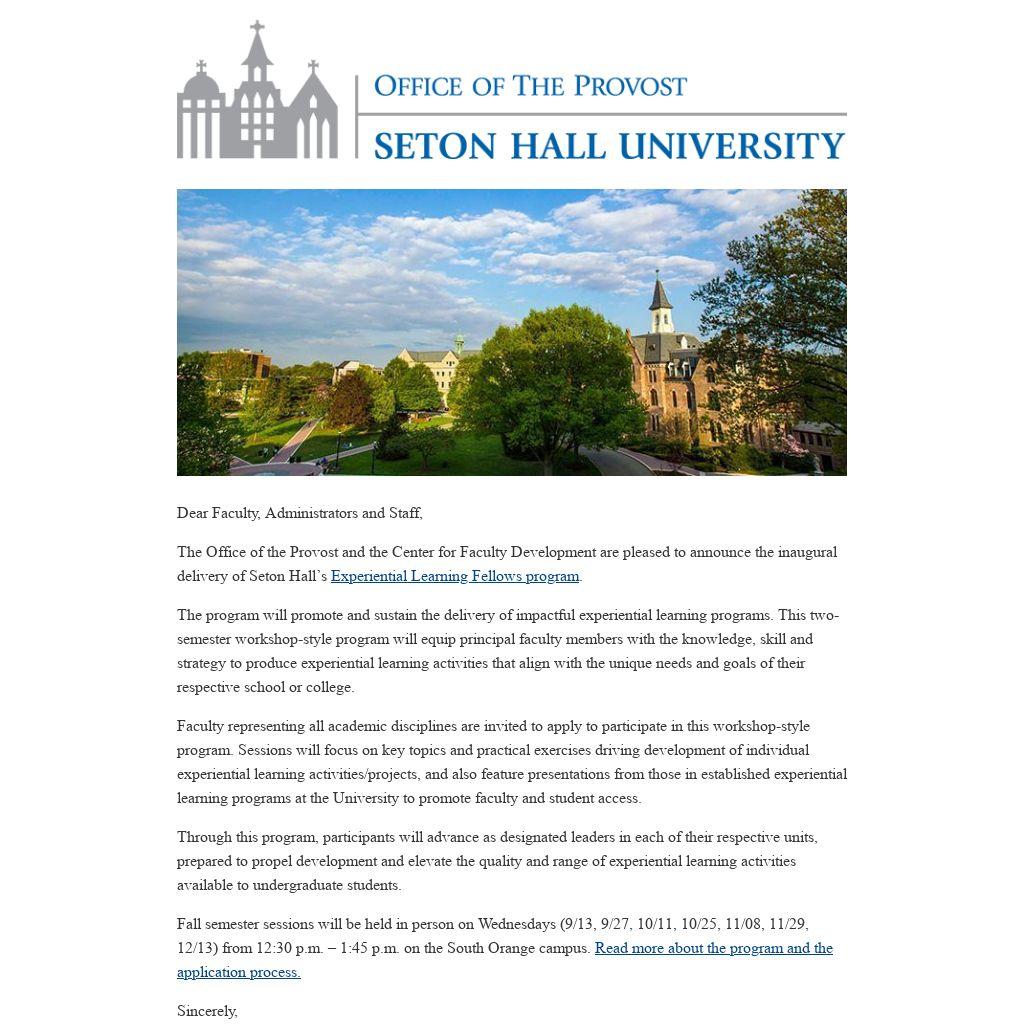 Faculty representing all academic disciplines are invited to apply to participate in this workshop-style program. Sessions will focus on key topics and practical exercises driving development of individual experiential learning activities/projects, and also feature presentations from those in established experiential learning programs at the University to promote faculty and student access.