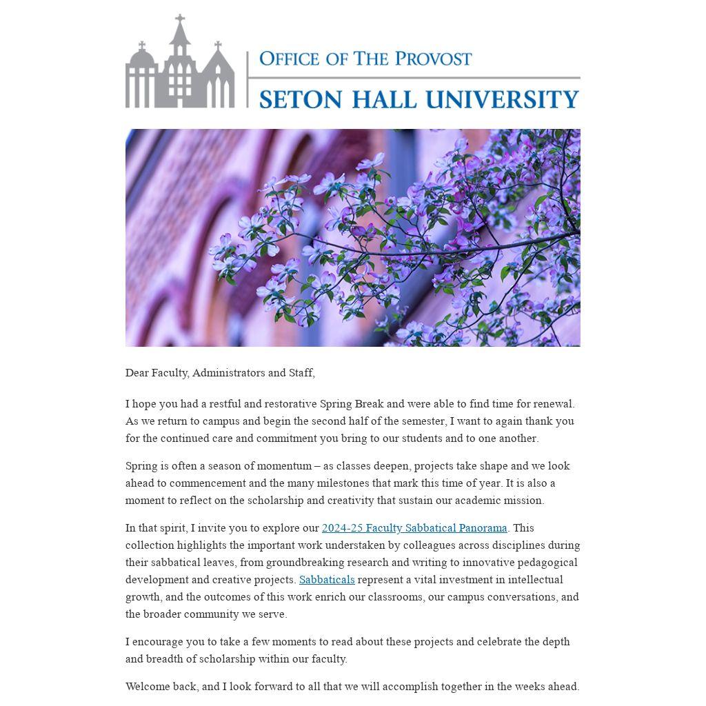 I hope you had a restful and restorative Spring Break and were able to find time for renewal. As we return to campus and begin the second half of the semester, I want to again thank you for the continued care and commitment you bring to our students and to one another.