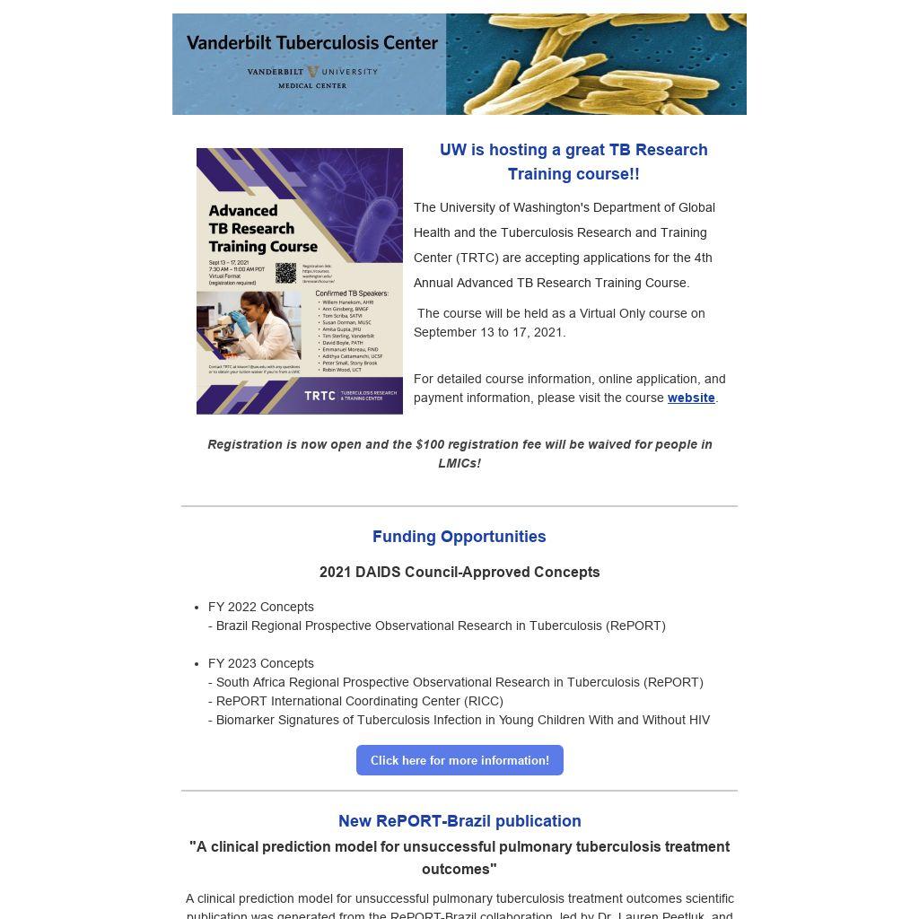 The University of Washington's Department of Global Health and the Tuberculosis Research and Training Center (TRTC) are accepting applications for the 4th Annual Advanced TB Research Training Course.