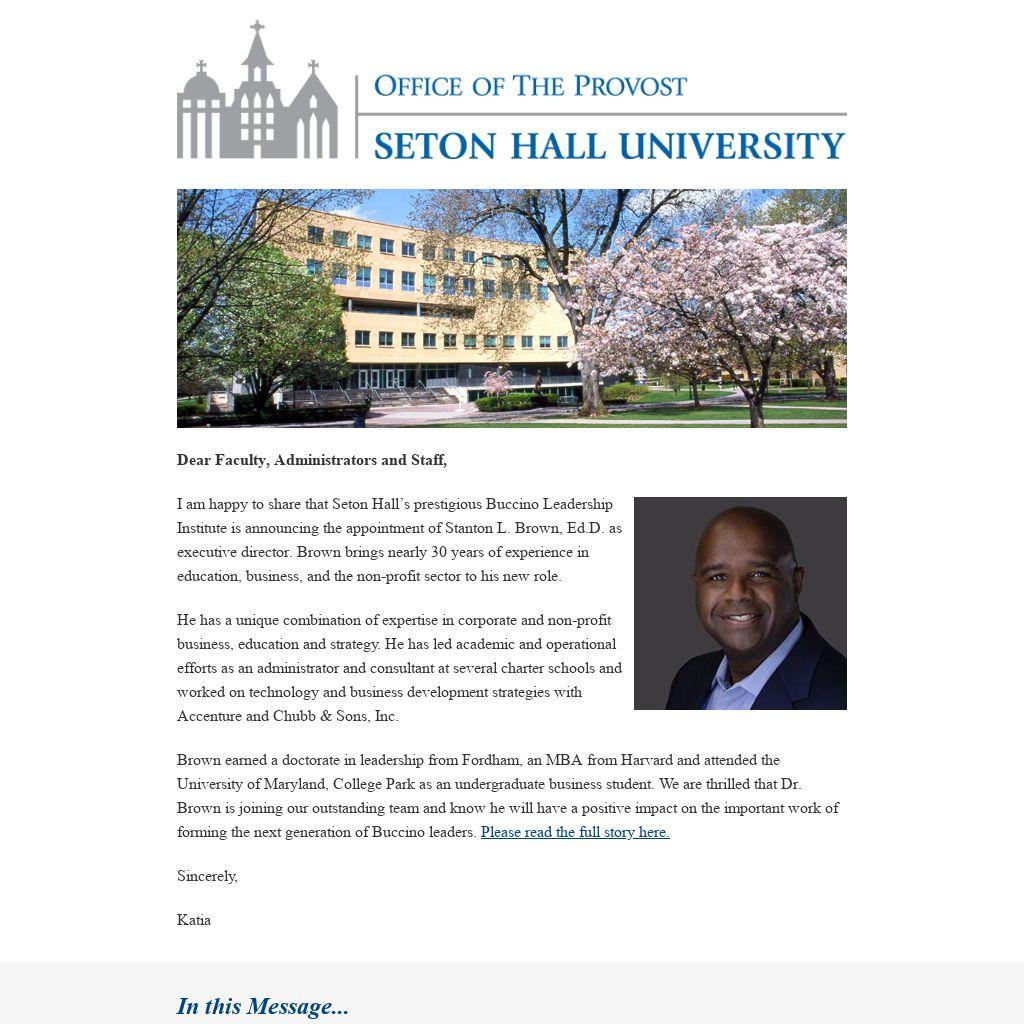 I am happy to share that Seton Hall’s prestigious Buccino Leadership Institute is announcing the appointment of Stanton L. Brown, Ed.D. as executive director. Brown brings nearly 30 years of experience in education, business, and the non-profit sector to his new role.
