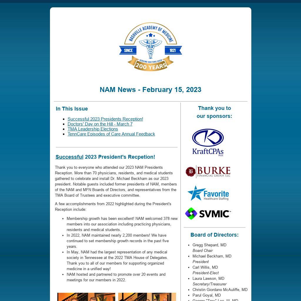 - In May, NAM had the largest representation of any medical society in Tennessee at the 2022 TMA House of Delegates. Thank you to all of our members for supporting organized medicine in a unified way!