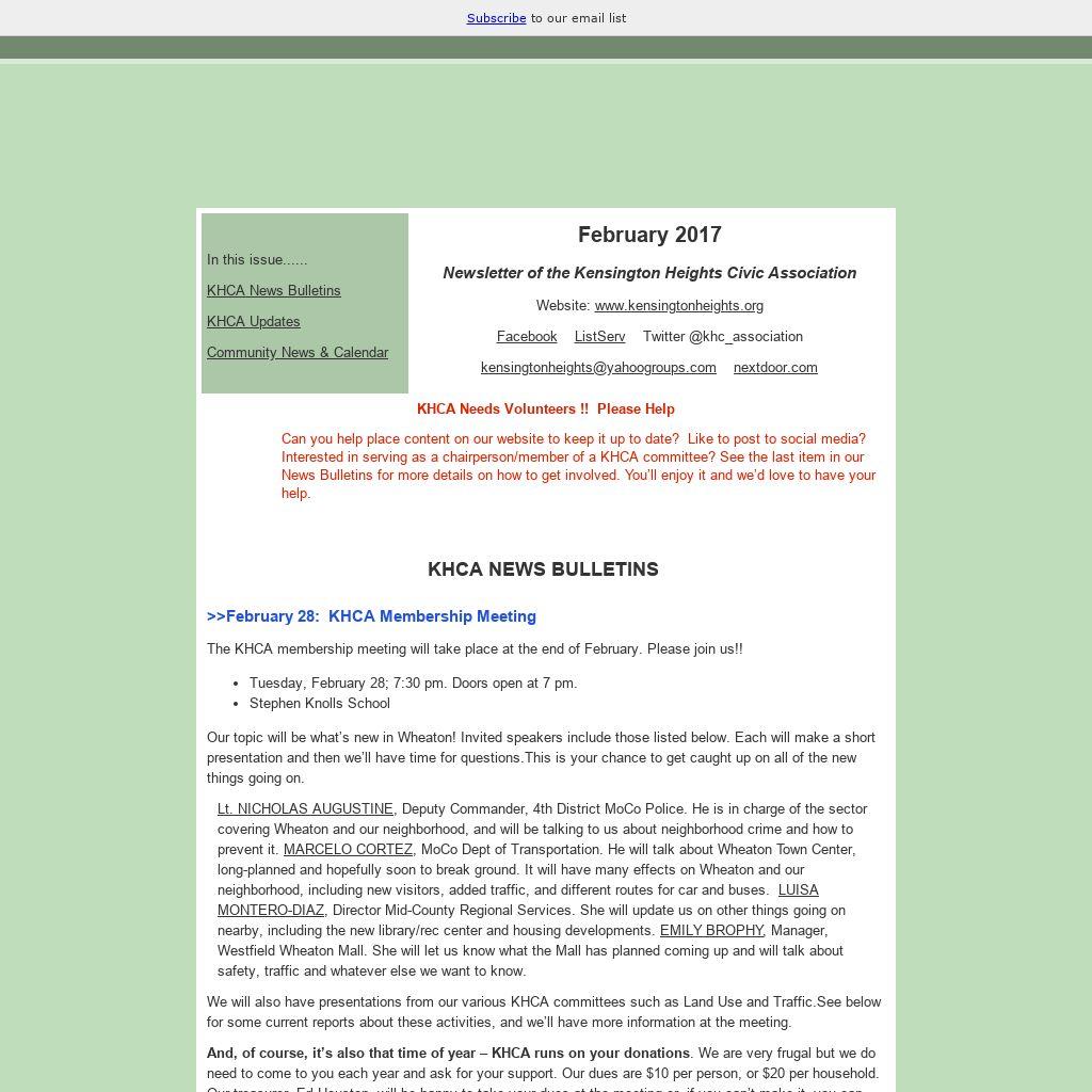 - A “Safety Task Force” is being formed to include representatives from residential communities, local law enforcement, County agencies and officials, and Westfield Mall (and hopefully WMATA). The group will determine ways to collaborate to work towards increased safety in Wheaton. The first meeting will be on February 27. KHCA has been invited to participate and we will be there.