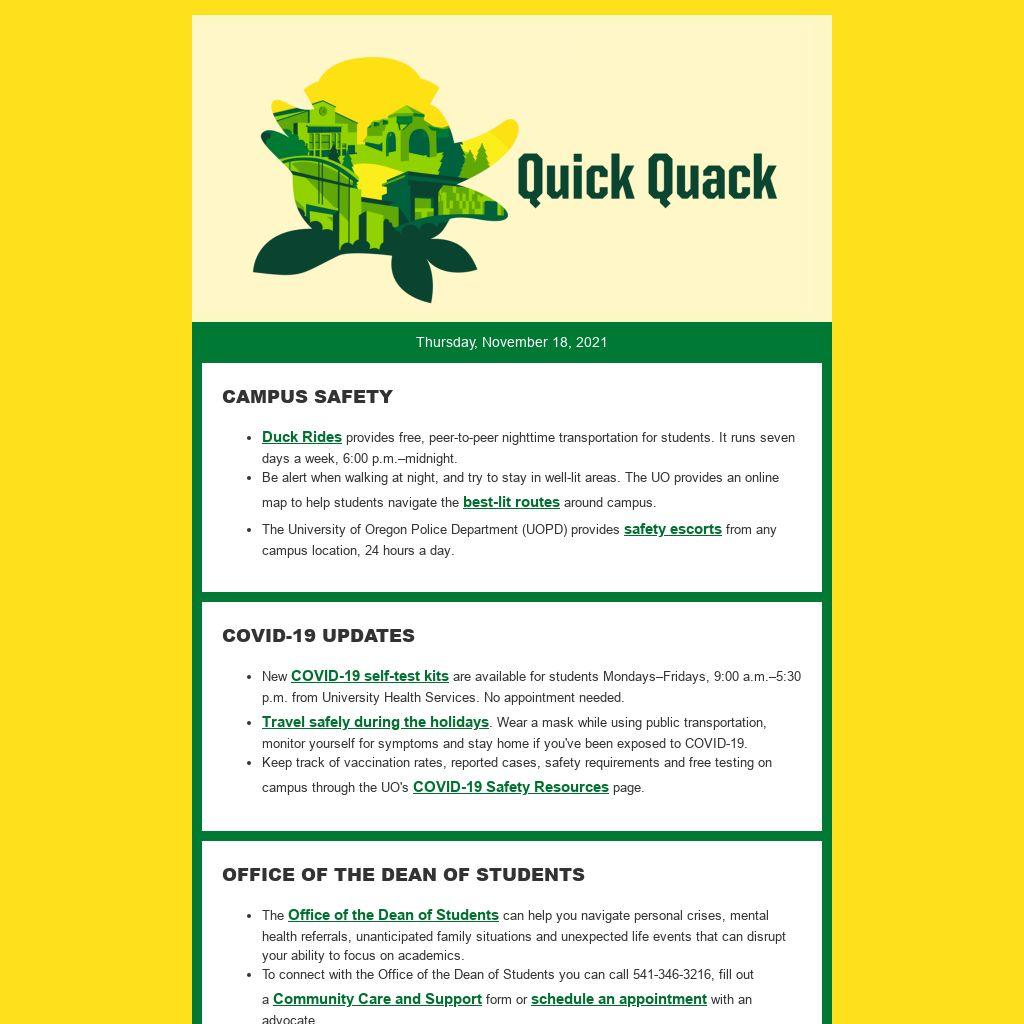 Duck Rides provides free, peer-to-peer nighttime transportation for students. It runs seven days a week, 6:00 p.m.–midnight.