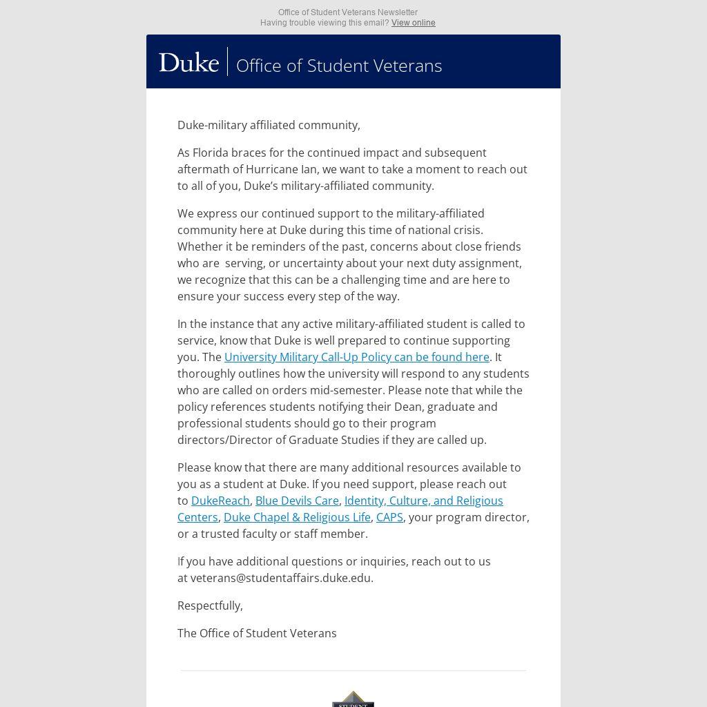 As Florida braces for the continued impact and subsequent aftermath of Hurricane Ian, we want to take a moment to reach out to all of you, Duke’s military-affiliated community.