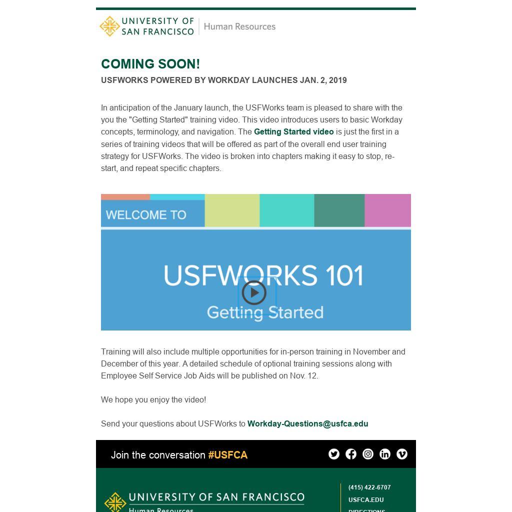 In anticipation of the January launch, the USFWorks team is pleased to share with the you the "Getting Started" training video. This video introduces users to basic Workday concepts, terminology, and navigation. The
