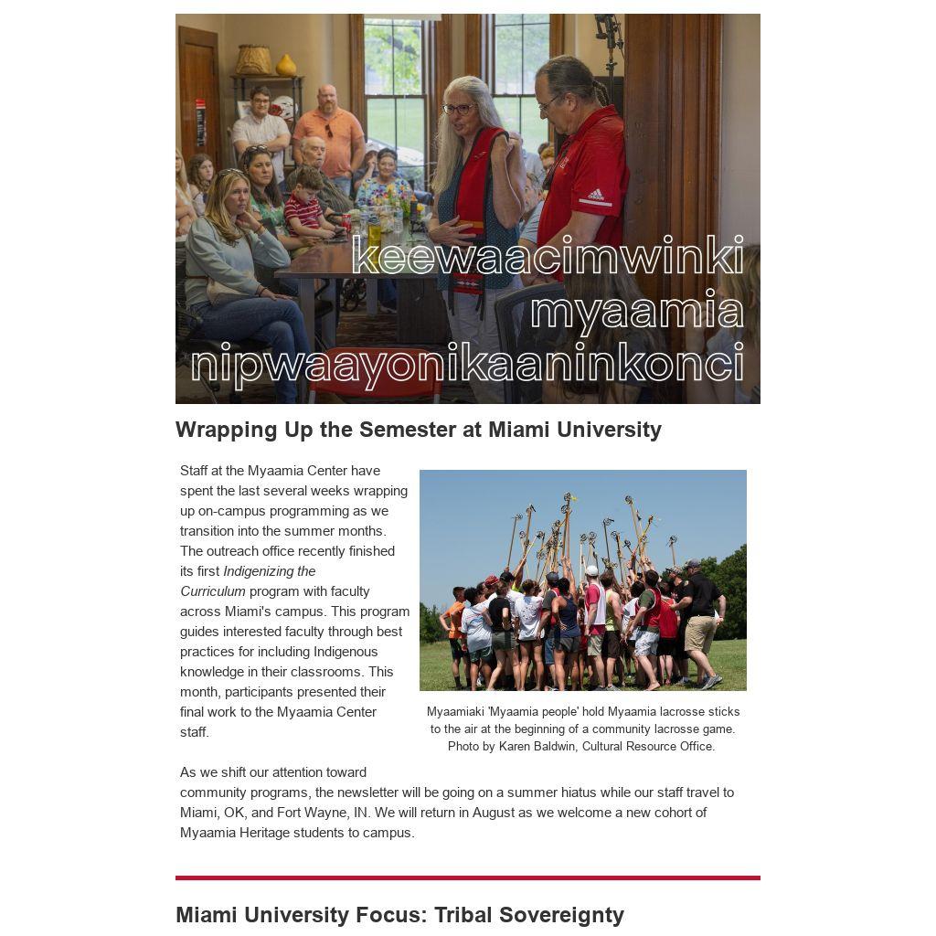As we shift our attention toward community programs, the newsletter will be going on a summer hiatus while our staff travel to Miami, OK, and Fort Wayne, IN. We will return in August as we welcome a new cohort of Myaamia Heritage students to campus.