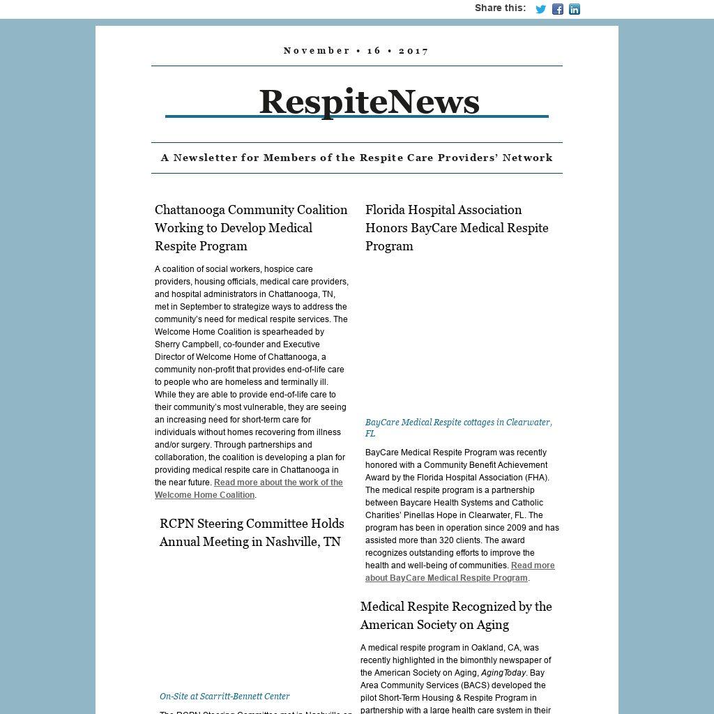 A coalition of social workers, hospice care providers, housing officials, medical care providers, and hospital administrators in Chattanooga, TN, met in September to strategize ways to address the community’s need for medical respite services. The Welcome Home Coalition is spearheaded by Sherry Campbell, co-founder and Executive Director of Welcome Home of Chattanooga, a community non-profit that provides end-of-life care to people who are homeless and terminally ill. While they are able to provide end-of-life care to their community’s most vulnerable, they are seeing an increasing need for short-term care for individuals without homes recovering from illness and/or surgery. Through partnerships and collaboration, the coalition is developing a plan for providing medical respite care in Chattanooga in the near future. Read more about the work of the Welcome Home Coalition.