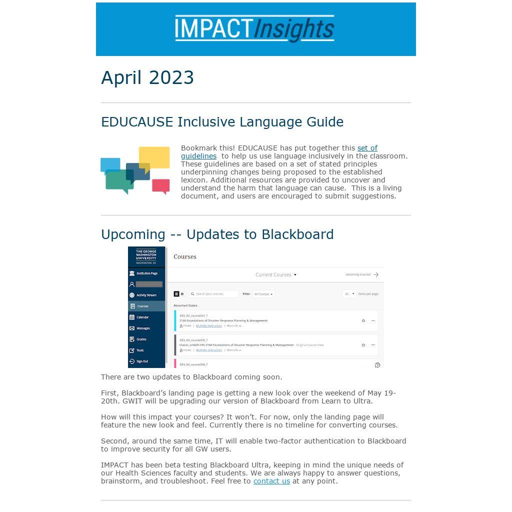 IMPACT has been beta testing Blackboard Ultra, keeping in mind the unique needs of our Health Sciences faculty and students. We are always happy to answer questions, brainstorm, and troubleshoot. Feel free to contact us at any point.