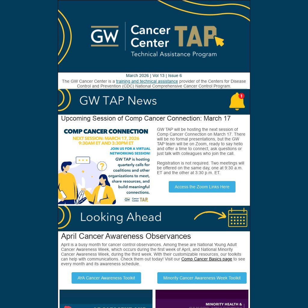 | GW TAP will be hosting the next session of Comp Cancer Connection on March 17. There will be no formal presentations, but the GW TAP team will be on Zoom, ready to say hello and offer a time to connect, ask questions or just talk with colleagues who join the call.