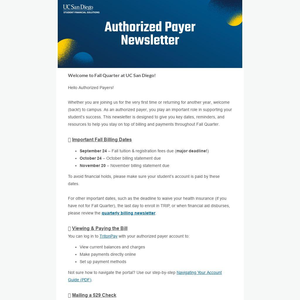 Whether you are joining us for the very first time or returning for another year, welcome (back!) to campus. As an authorized payer, you play an important role in supporting your student’s success. This newsletter is designed to give you key dates, reminders, and resources to help you stay on top of billing and payments throughout Fall Quarter.