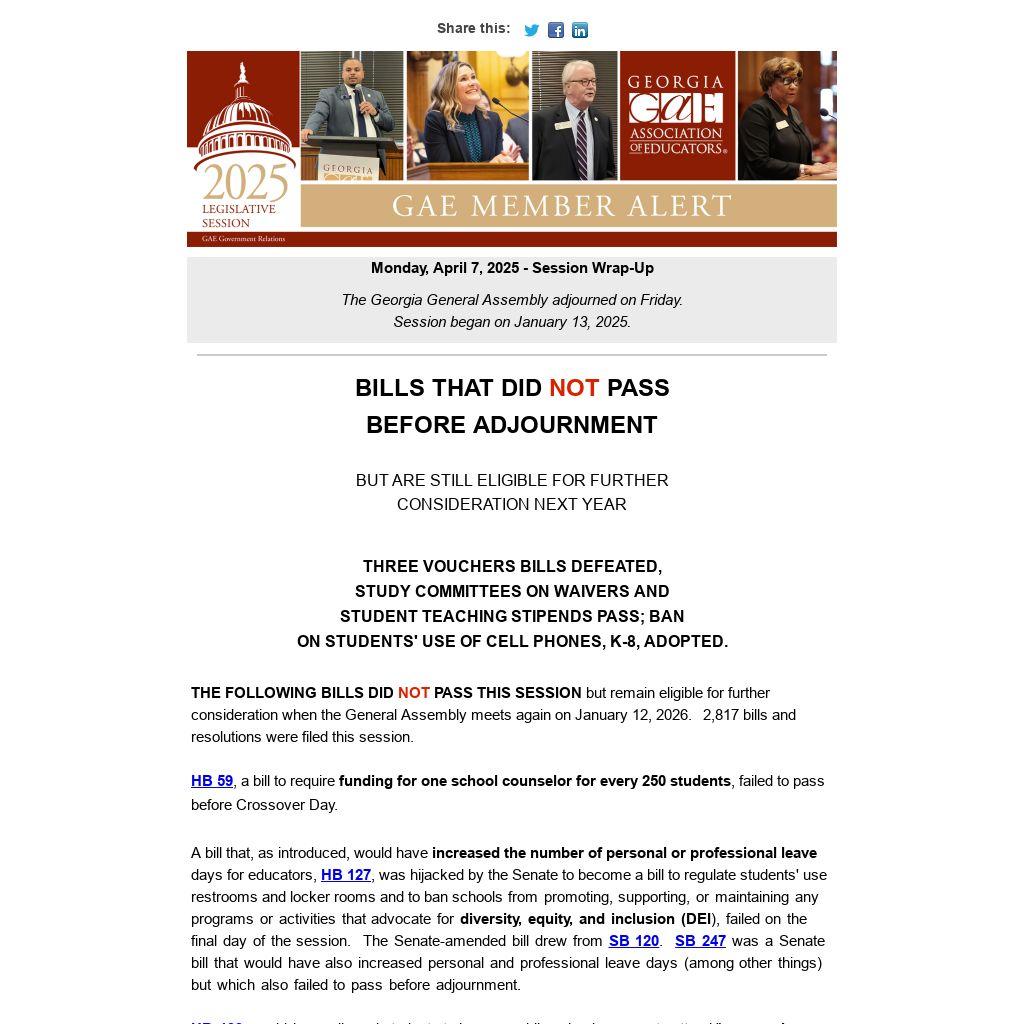 A GAE-initiated bill, HB 310, to provide compensation for student teachers, received favorable comments from both Republicans and Democrats when it was heard in the House Education Committee. The bill carries over to the next session. A twin bill in the Senate, SB 300, is also eligible for consideration in 2026.