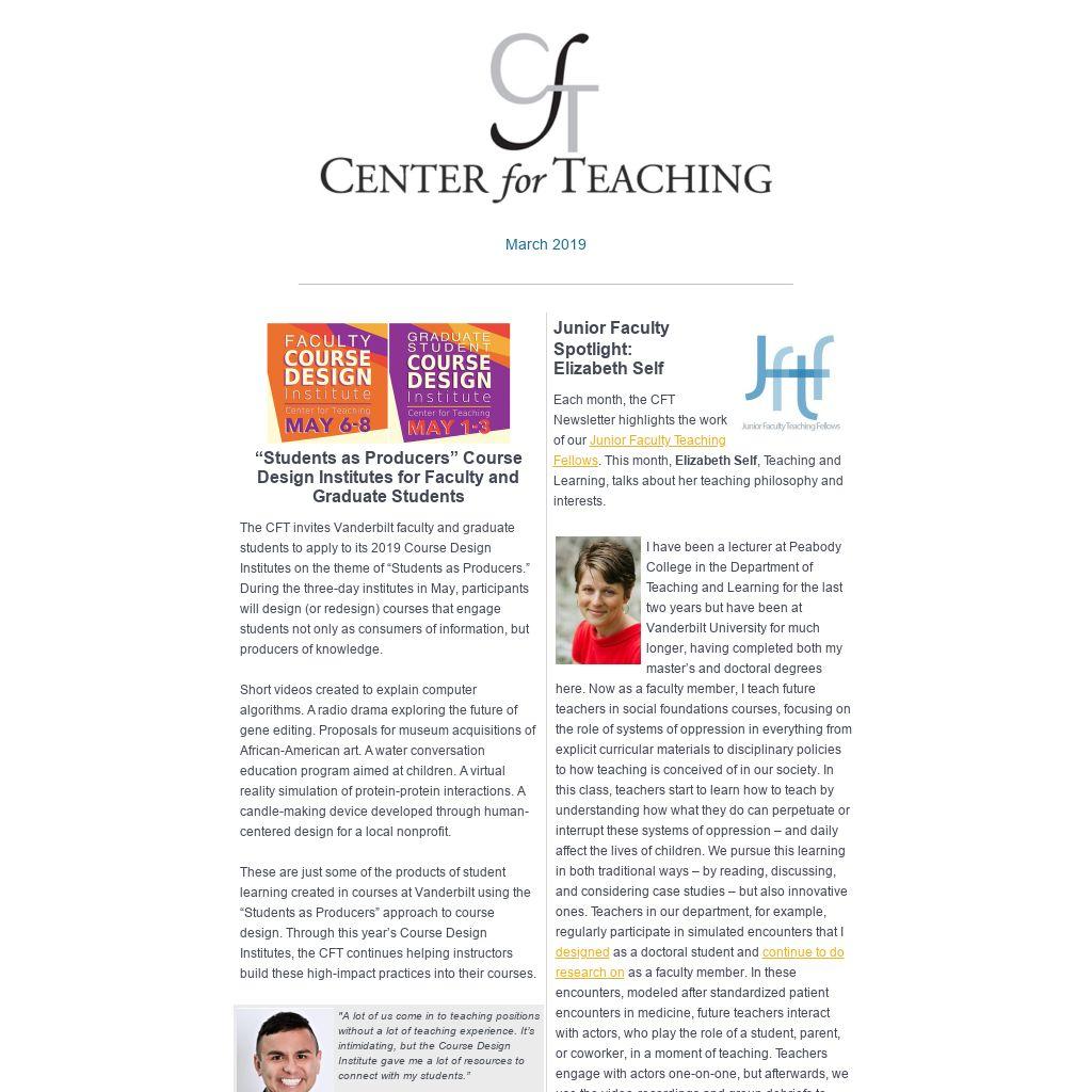 | “Students as Producers” Course Design Institutes for Faculty and Graduate Students The CFT invites Vanderbilt faculty and graduate students to apply to its 2019 Course Design Institutes on the theme of “Students as Producers.” During the three-day institutes in May, participants will design (or redesign) courses that engage students not only as consumers of information, but producers of knowledge.