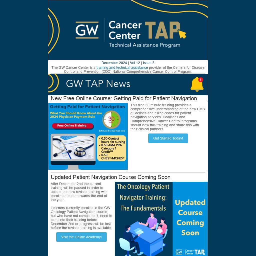 Learners currently enrolled in the GW Oncology Patient Navigation course, but who have not completed it, need to complete their training before December 2nd or progress will be lost before the revised training is available.